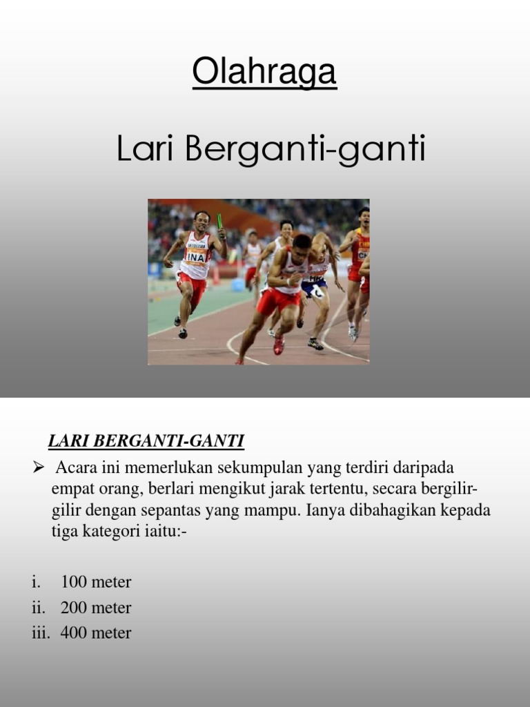 Up to 24 cash back Acara lari berganti-ganti relay seperti 4X100 meter 4X200 meter dan 4X400 meter merupakan satu acara yang memerlukan para atlet sentiasa berada pada tahap kecergasan fizikal yang tinggi. Setiap acara adalah berlainan di mana ianya berasaskan kepada pergerakan-pergerakan semulajadiContohnya berlari melompat dan membalingLari berganti-ganti merupakan salah satu acara olahraga yang disukai ramai oleh penonton dalam acara olahraga. Resident Boston MA Dr.
